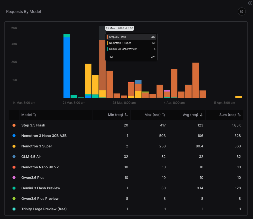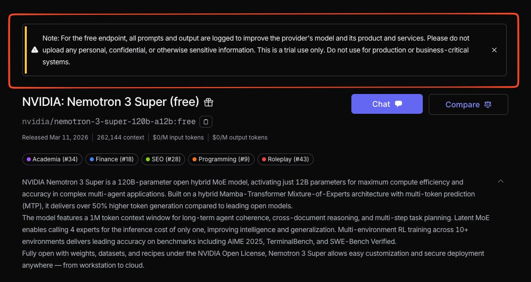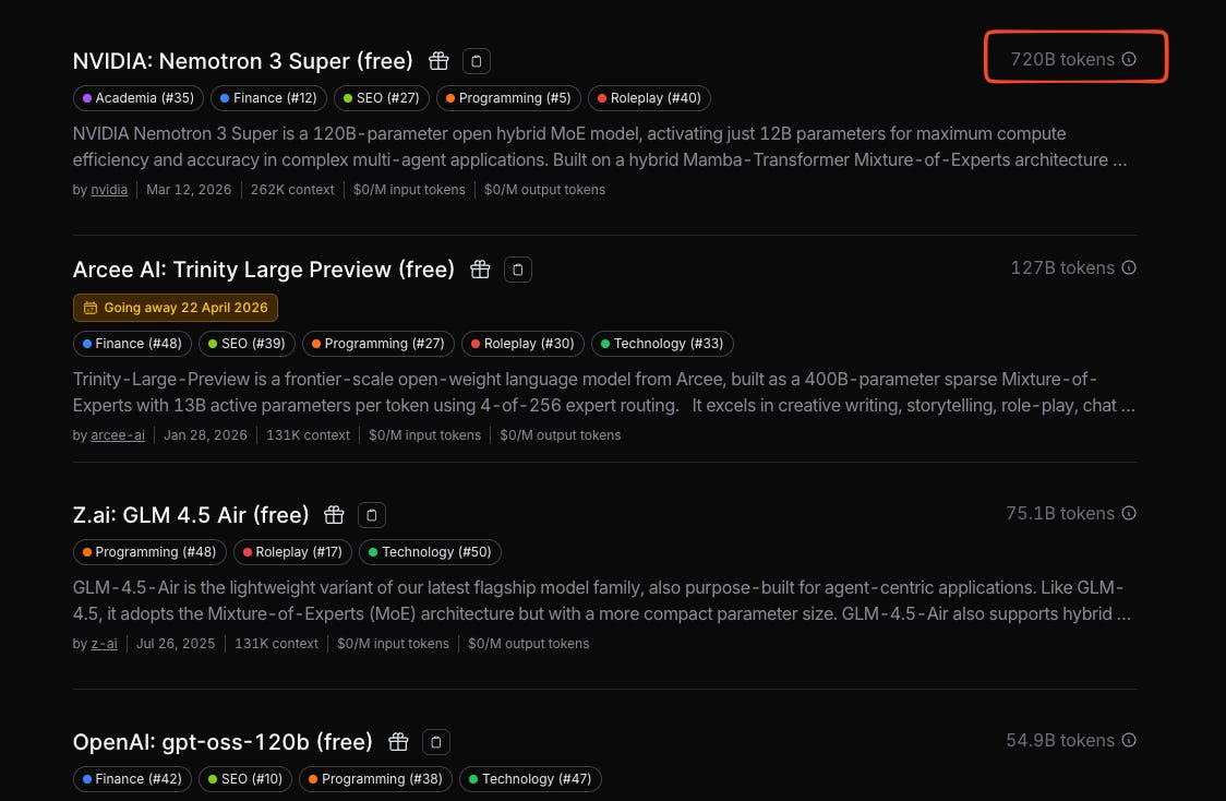 At the time of writing, NVIDIA’s Nemotron 3 Super is the most popular free model on OpenRouter.