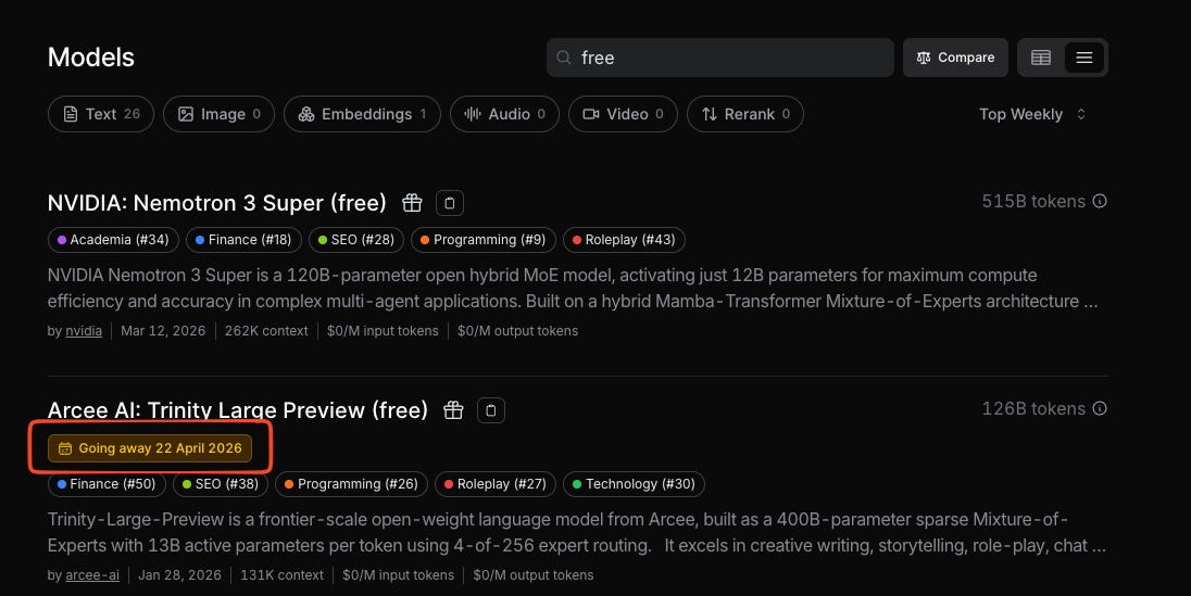 After the Step incident, I’m showing less loyalty to any models on the free tier. They will come and go, and I’ll just enjoy the free inference while it lasts.